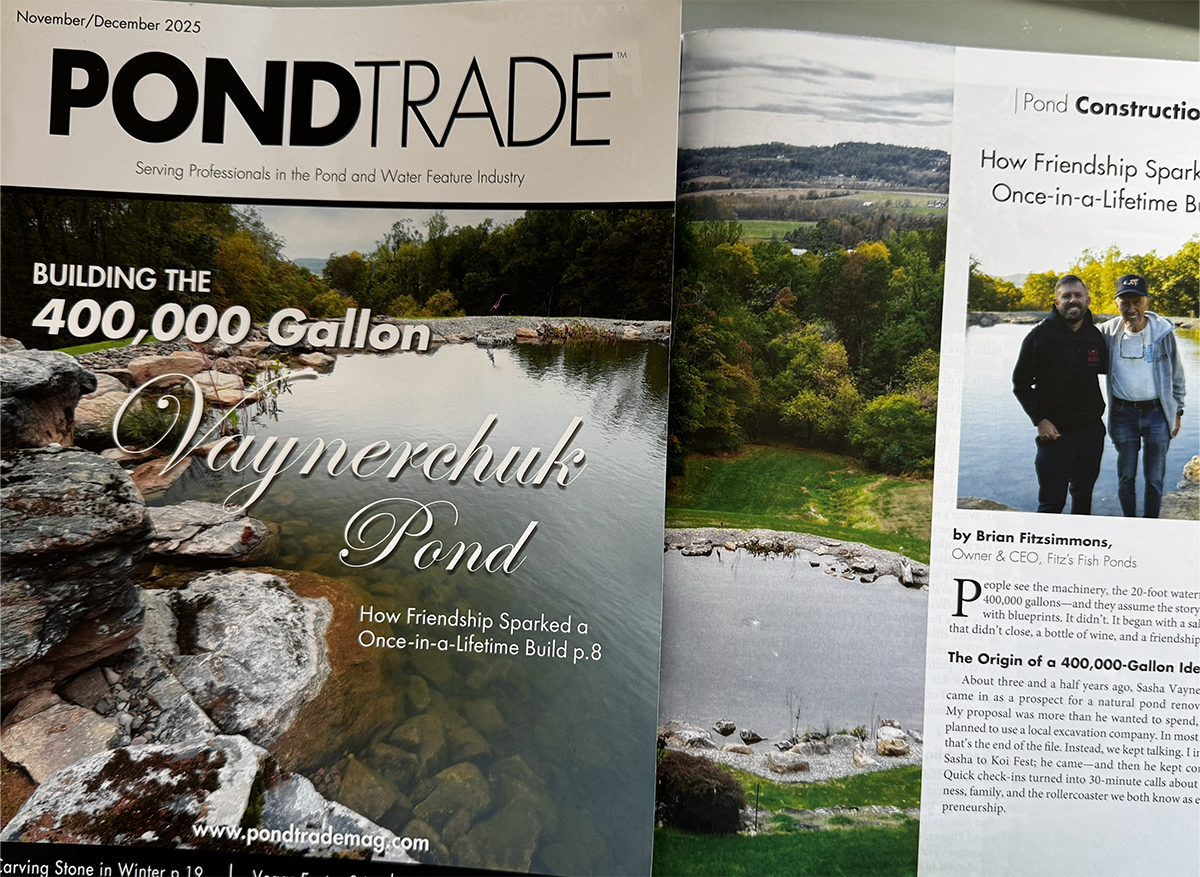 Pond Trade Magazine – November/December 2025 – “Building the 400,000 Gallon Vaynerchuk Pond” – pages 9-15